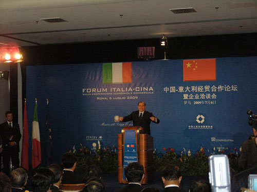 7月4日代表团启程,7月6日下午中国经贸投资代表团参加了中意经贸合作论坛暨企业洽谈会,下午三点(罗马时间)中国国家主席胡锦涛和意大利总理贝鲁斯克尼一起到达会场,意大利总理贝鲁斯克尼发表讲话,对胡主席及中国经贸投资代表团的到来表示热烈的欢迎,中意两国同是历史悠久文化灿烂的伟大国家了,四百多年前,意大利旅行家马可波罗曾经到达中国,那时中国和意大利的经贸往来就已经十分频繁,中意两国的经贸合作有非常好的历史和未来。胡主席发表了重要讲话,并对中意两国的经贸合作提出五点建议。